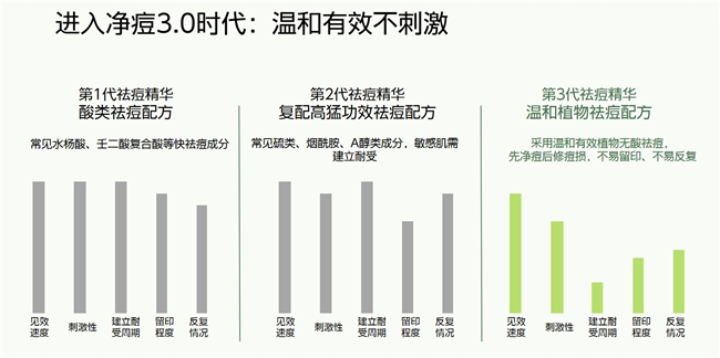 3.0植物温和时代:采用温和有效的植物成分,不止于“战痘”,更注重“修护痘损”,目标是减少反复、不易留印。斛说“小青瓶”便是第三代配方的践行者。