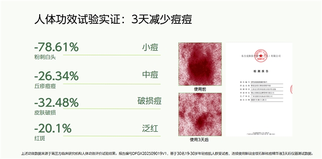 它跳出了“为祛痘而损伤屏障”的恶性循环。通过金钗石斛精准净痘、铁皮石斛深层修护、复配本草协同舒缓,形成一个“攻击-防守-修复”的闭环。人体功效试验显示,连续使用3天,痘痘减少率达78.61%,同时肌肤锁水力提升,水油平衡改善。